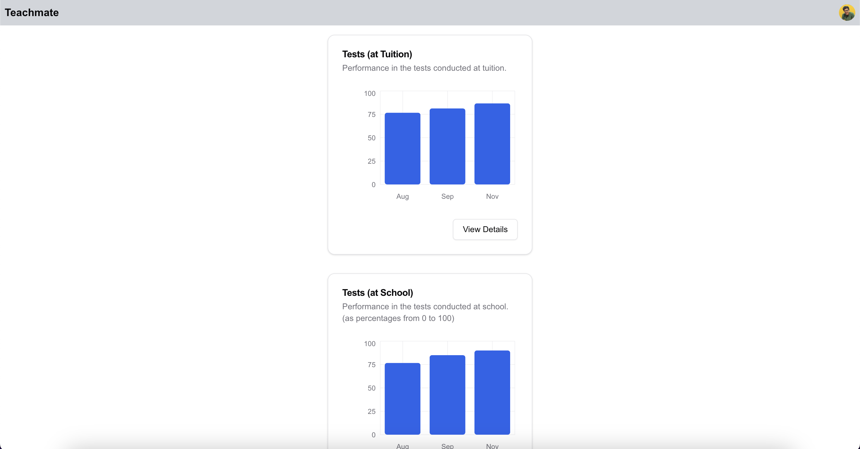 I wanted to build a platform that would improve the way class efficacy is tracked by using charts to display students' marks in school tests and tuition tests. This would help the teacher assess whether her methods are working, while also allowing parents to see the impact of the classes. This is where shadCN really shined.